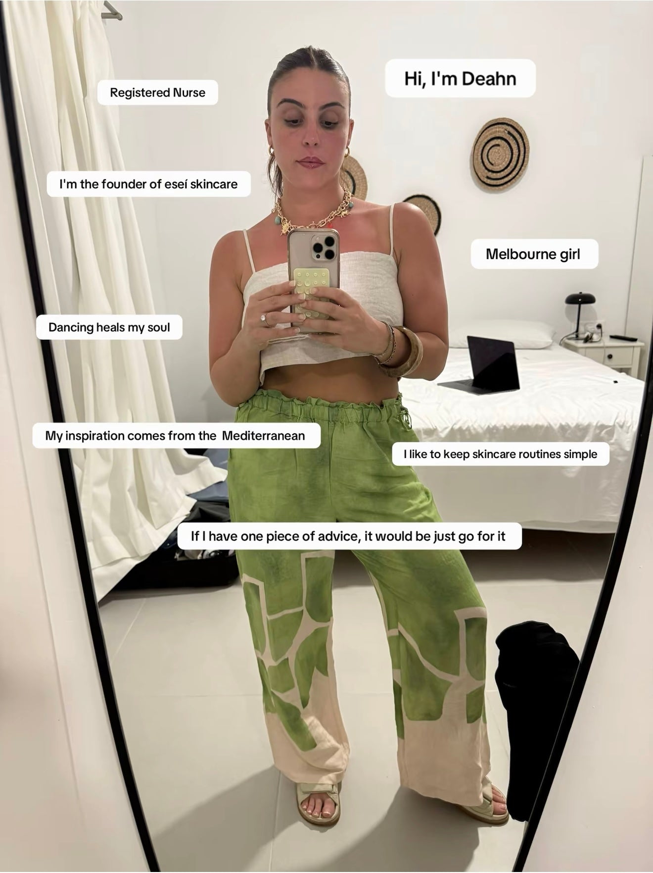 Melbourne-based founder, Deahn Sakkas, is an experienced makeup artist and cosmetic nurse who, through a decade of experience, has helped hundreds of clients see themselves in a new light. As someone with acne-prone skin, her personal journey with her own skin has fuelled her passion in this space. It fuelled her to create a skincare line that honours her Greek heritage and reflects the stripped back, natural beauty of Mediterranean shores.